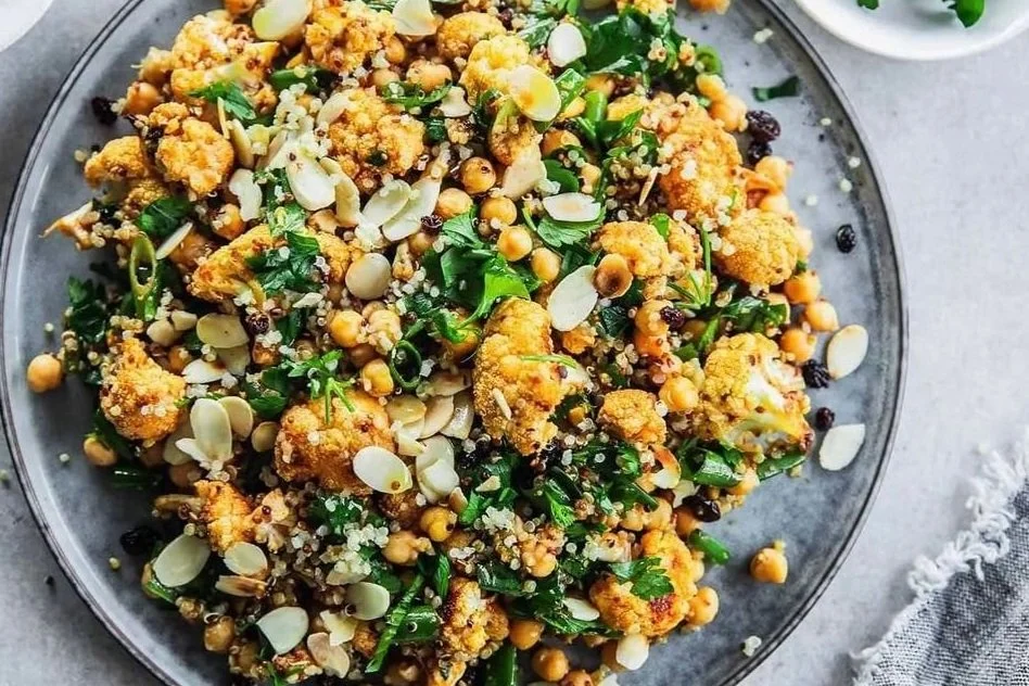 Remove the cooked cauliflower from the pan and place in a bowl. Stir in the turmeric, chickpeas, currants, almonds, carrots, green onions, parsley, seeds, and lemon juice until well combined.